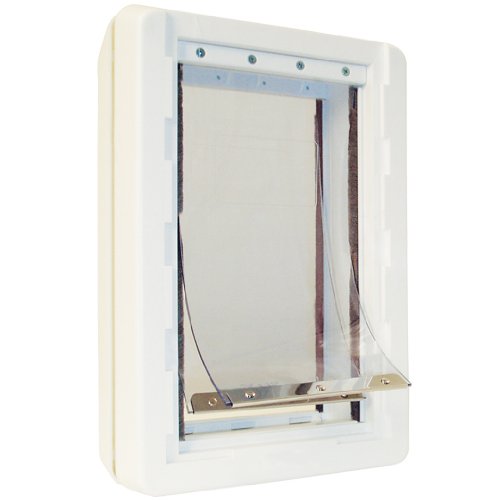 Adjustable frame telescopes 1 1/4"" - 1 3/4"" thickness..Innovative double vinyl flap design creates vitality efficient air pockets for optimum insulation..Optional wall package sold one after the other..Nylon fur draft restrictor..Energy efficient structural foam molded plastic.. Pet door for wall or door utility. All weather thermal insulated pet door with lockout slide. Features include: Energy environment friendly structural foam molded plastic. Adjustable body telescopes 1 1/4" - 1 3/4" thickness. Nylon fur draft restrictor. Innovative double vinyl flap design creates vitality environment friendly air pockets for maximum insulation. Optional wall kit bought separately. Limited lifetime guarantee.. ... Read more Perfect Pet All Weather Door AWXL - X Large flap 9 3/4" x 17"